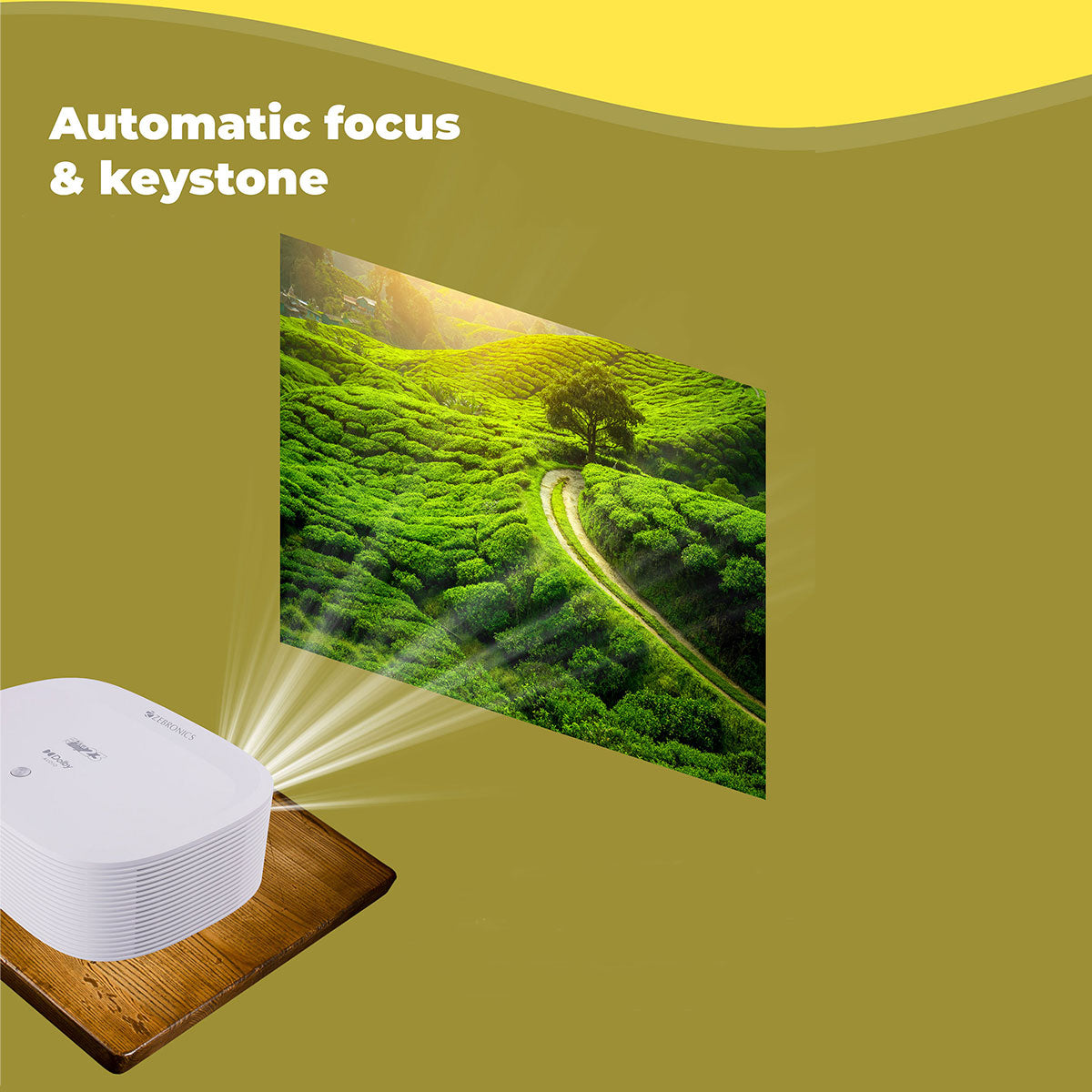 The projector comes with autofocus and auto keystone adaption technology. With the auto keystone technology, the projector will automatically detect and correct the image alignment.