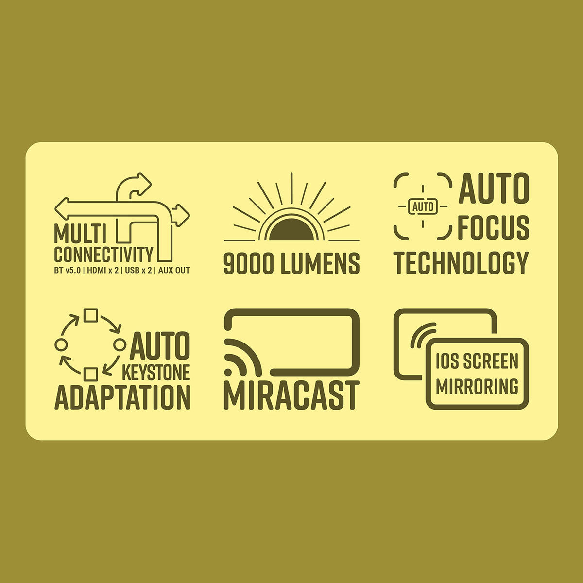 The projector is designed with a high brightness LED lamp, which can go as high as 9000 lumens. The projector's high brightness can allow the beam to travel a longer distance.  The contents can be played at the finest picture resolution of 1080p FHD with ease even on a largely sized screen.