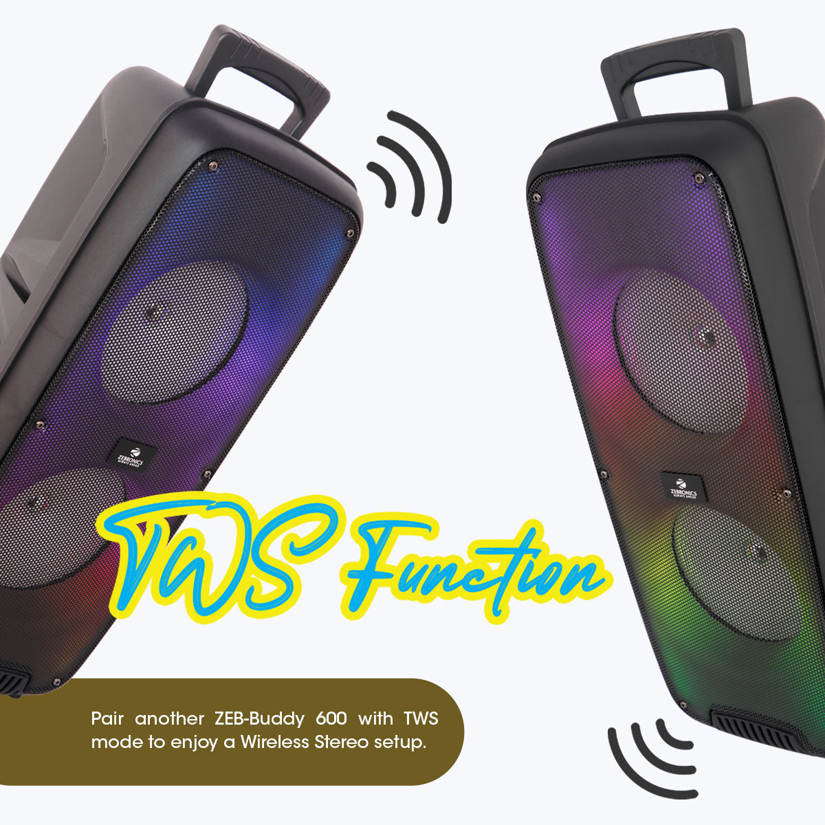 ZEB-Buddy 600 portable BT speaker has dual full-range 16.51cm drivers that deliver powerful music with thumping bass. It also has controls for volume/media. |