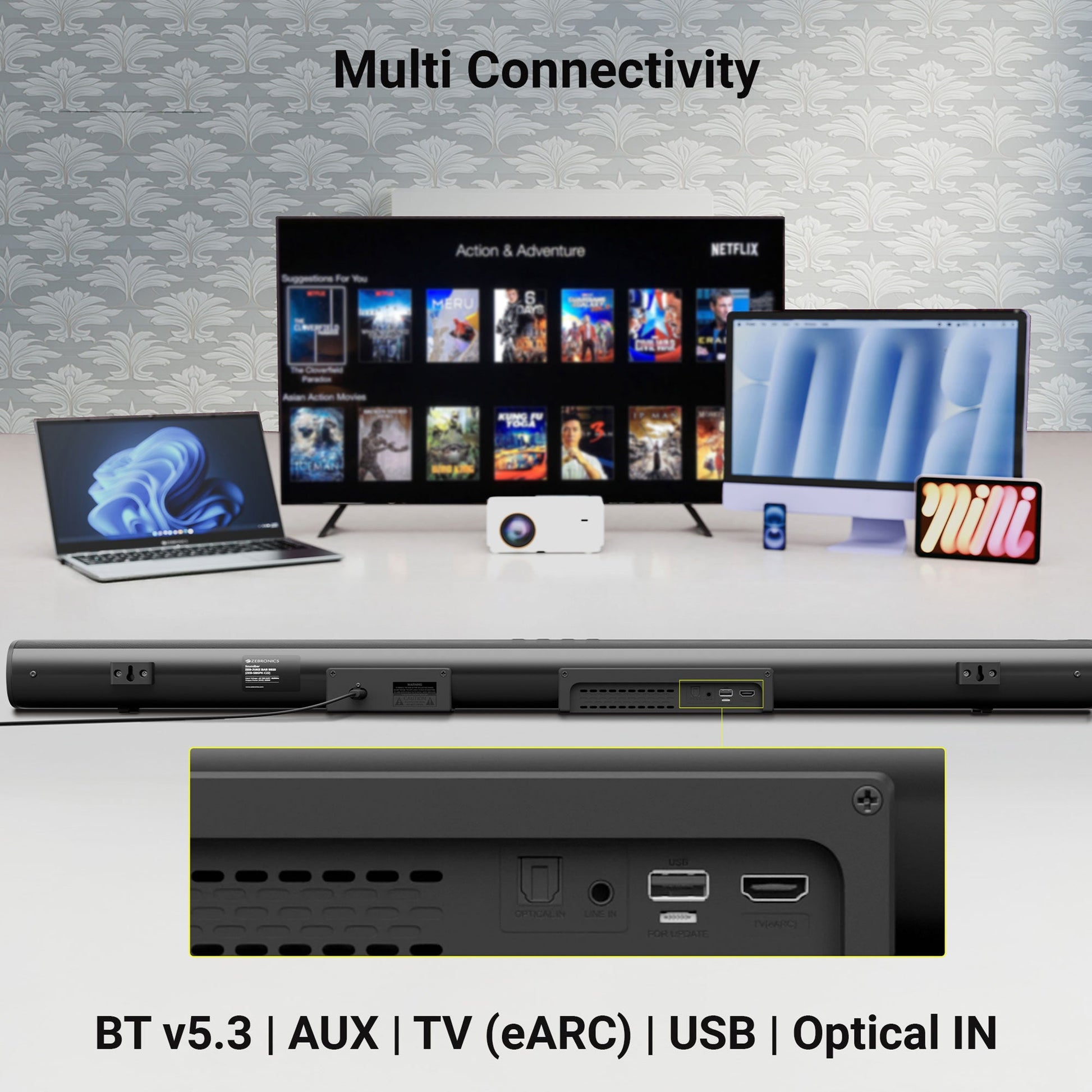 BT v5.3 | TV (eARC) | Optical IN | USB | AUX